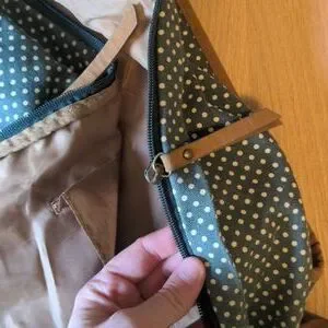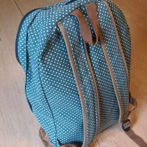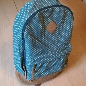 Green and white polka dot bookbag (canvas) with light brown accents (faux suede). Has a front zip pocket with two open pockets and a zip pocket in the main compartment. Gently used and in good condition. One zipper handle to the main compartment came off the zipper track but the other zipper is still good and keeps the bag closed.