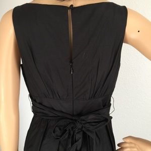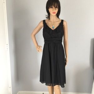 Simple black dress with Ruffle collar. It has a beautiful waist belt and a hidden back zipper with a Key hole and button. The dress is 70% Cotton and 30% Silk. Dress is a size 2 and it is in excellent condition almost like brand new.