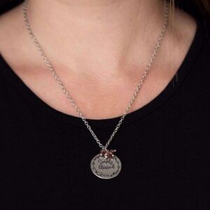 Bordered in a leafy pattern, a shiny silver disc is stamped with the phrase, "Simply Blessed," joins a dainty cluster of iridescent purple crystal-like beads at the bottom of a chain, creating an inspirational pendant below the collar. Features an adjustable clasp closure.
