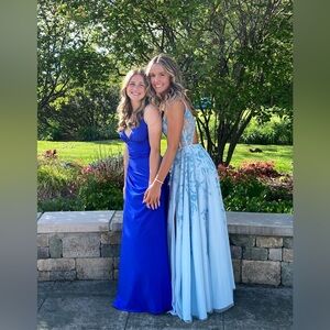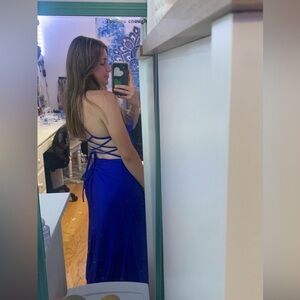 Stunning blue v-neck prom dress with leg slit. Perfect for prom or other events. Tie up back to accommodate different sizes. Size 2, only worn once, hemmed in length and slightly in waist/butt area (For reference I am 5'3, 110 pounds).