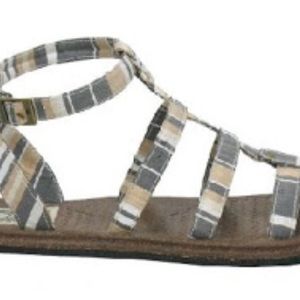 Eco friendly Simple Brand gladiator sandals in a grey/brown silk design. Made entirely from organic and recycled materials, the sole being a recycled car tire.