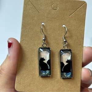 Simple bead design dangle earrings featuring cat silhouette with a moon background. Fish hook backs.