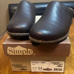 Smooth leather slip-on clog with a speckled midsole. Easy on-and-off design. Neutral, versatile style.