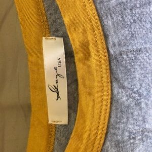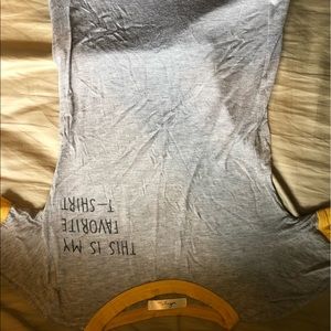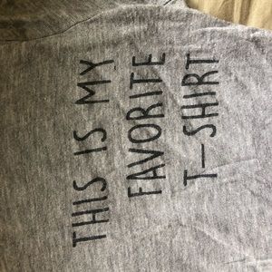 Gray, yellow rims on neckline and around arms, says “this is my favorite t-shirt” in the top corner, very soft and stretchy, tight, plain gray back
