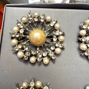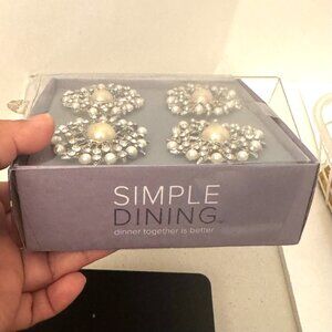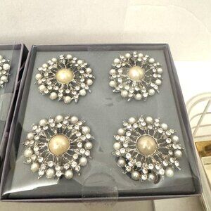 Simple Dining Round Napkin Rings Holder Set 8 Rhinestone Faux Pearl Silver Metal