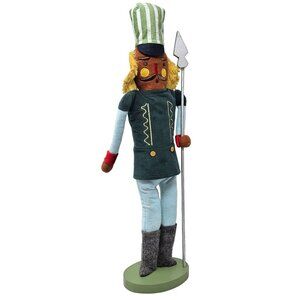 This ethnic nutcracker is constructed of fabric designed around an interior wire frame. The nutcrackers arms are floppy and he is standing on an fiberboard wood base. His outfit is a green top with gold accents, blue pants, gray boots and a green striped hat.