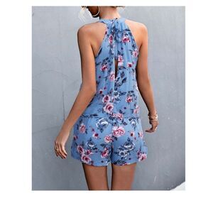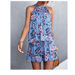 Simple Flavor | Blue Floral Open-Back Halter Neck Top & Shorts M # A269