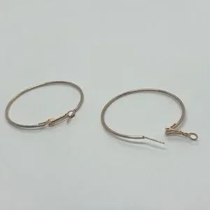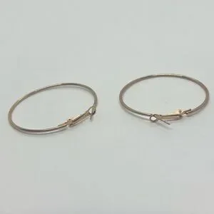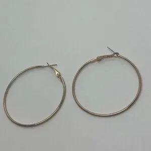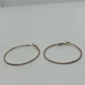 These gold colored hoops are slightly rosy. I would say between a gold and a rose gold. Medium to large size. Unsure of brand or materials used. Hinge activated closure. Excellent condition.