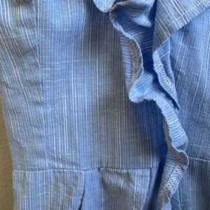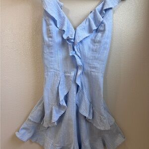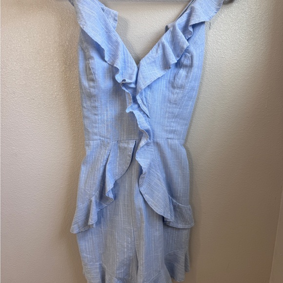 Chic mini dress with ruffle details. Light blue hue. Perfect for casual outings.