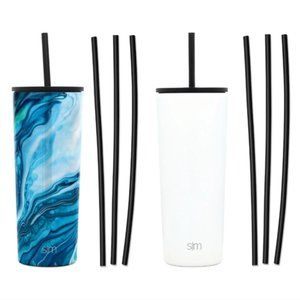 The Simple Modern Classic tumbler is double-walled and vacuum-insulated to keep your drinks hot or cold for hours. The two-pack contains two unique Simple Modern Classic Tumblers with six additional color-matched straws. The Classic is made from 18/8 stainless steel and fits most cupholders.