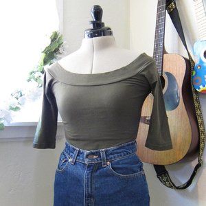 This is a lovely top. Its light, the color is a nice rich olive, the sleeves go down just above the elbow, the material is a lightweight jersey with surprising structure and a little stretch. In perfect gently worn condition.