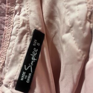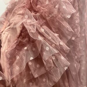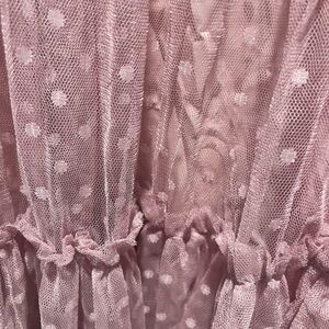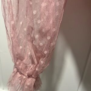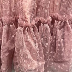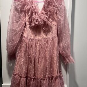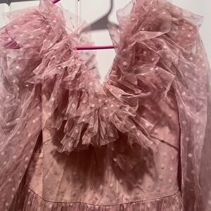 Elegant pink dress with polka dots. Features ruffled neckline and sleeves. Perfect for weddings.