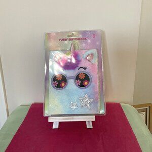 NWT The Simple Pleasures Fuzzy Sketchbook is a notebook designed for drawing and creative doodling, suitable for ages 6 and up. The sketchbook features a soft, plush, rainbow-colored unicorn cover with glittery accents and star details.