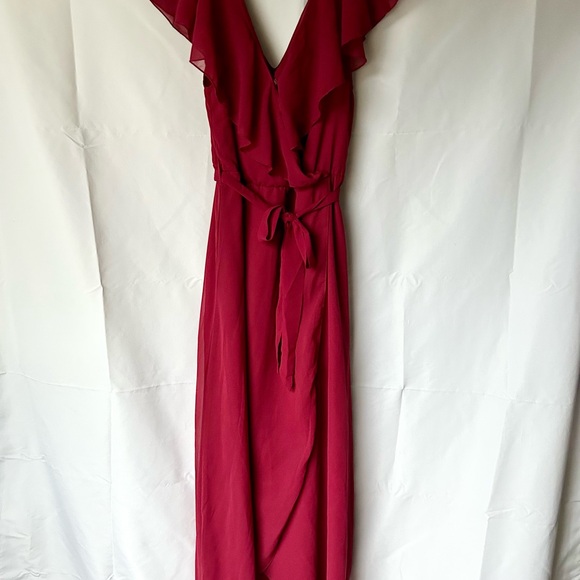 Chic red maxi dress with ruffle accents. Features a tie waist for a flattering fit. Ideal for any event.