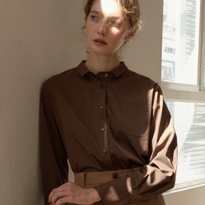Simple Retro brown button down shirt with French cuffs and a small lapel. New with tags. Size large. A more relaxed fit. Works for more delicate and classic styles, light academia, or dark academia.