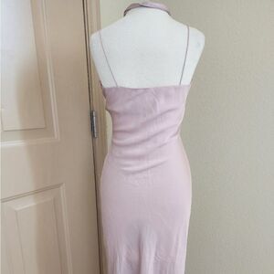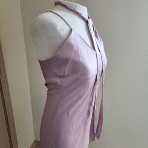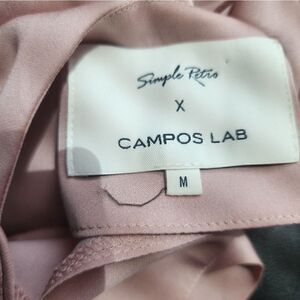 Super cute and flattering, Simple Retro X Campos Lab pink satin slip dress size M. Spaghetti straps, Unlined, has a neck tie. 90% MS, 10% PVB. Measures approximately 18" chest measuring from underarm to underarm and 42" long measuring from back collar to hem.