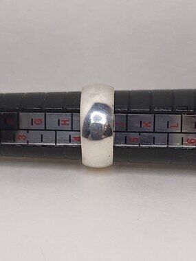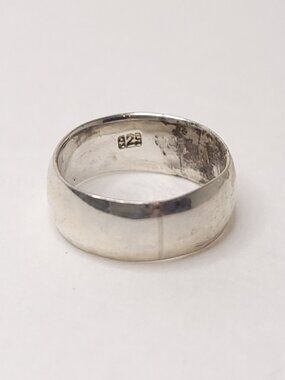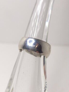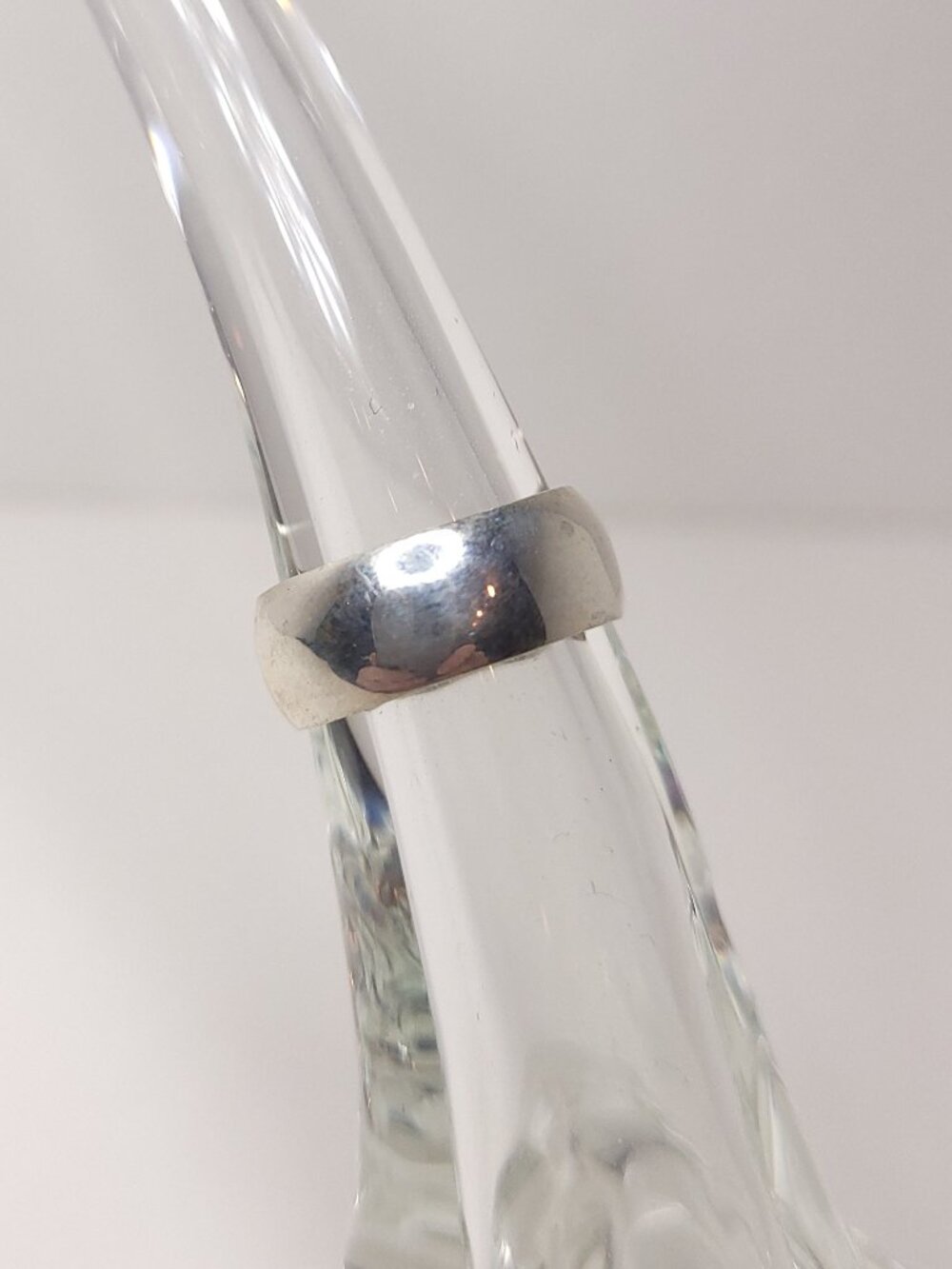 Simple highly polished silver band. It is a size 4 and approximately 1/4 inch wide. This ring is stamped with "925" inside the band and has some very minimal signs of wear. Its simplicity is its beauty!