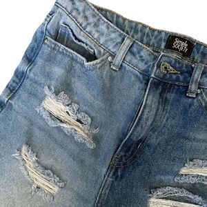 Cute medium wash blue denimh hi-rise bermuda shorts. Distressing front & back. 5 pocket. Button/zip fly. Cotton/rayon fabric. In excellent preowned condition. Simple Society Size 5/27