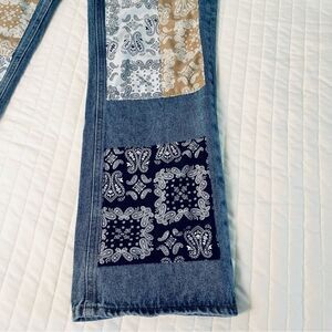 Stylish patchwork denim jeans featuring a unique design with blue, black, and tan accent patches on the front of the jeans. Perfect for adding a trendy touch to your wardrobe.