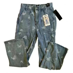 Simple Society Womens 5/27 Super High Rise Baggy Denim Jeans Butterfly Print