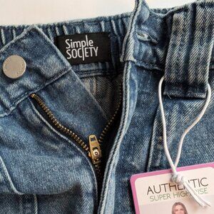 The product is a pair of Simple Society Women's Cargo Shorts in a size 27, designed with a super high rise fit. These blue shorts feature a comfortable stretch fabric and come with pockets and stretched waist for added functionality. They are accented with both a button and zipper for secure closure. Perfect for casual wear, these cargo shorts offer a stylish and practical option for everyday outfits.