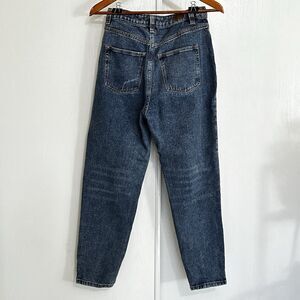 Simple Society Women's Jeans in size 5/27, featuring a high-rise, relaxed fit with a straight leg style. Made of 100% cotton denim in a medium wash blue color with distressed accents. The jeans have pleated legs, a 5-pocket design, and a logo detail. Designed for juniors, these breathable and comfortable jeans are suitable for all seasons, with a vintage 80s and 90s theme.