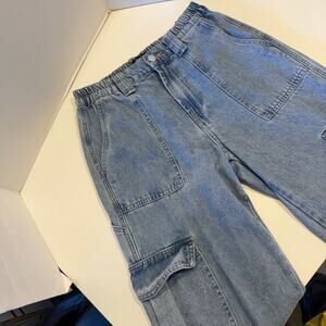 Simple Society cargo pocket utility pocket, high-rise, elastic waist, straight leg, large deep pockets on the legs, slip back pockets, button with zipper close, cotton/rayon/poly fabric, structured relaxed fit denim, women’s size 27 in great condition.