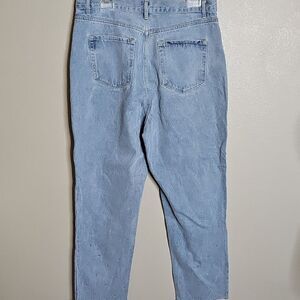 Stylish light blue denim jeans featuring iridescent crystal studs on front and lower back of legs. Perfect for casual wear. Simple Society AB Rhinestone Studded High Rise Button Fly Straight Denim Jeans in excellent condition 13/31