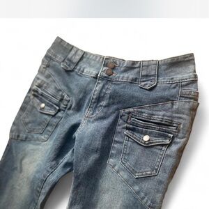 low-rise flare, denim jeans, y2k style, rave fashion, embellished pockets, vintage jeans, bootcut, distressed denim, 2000s nostalgia, casual denim