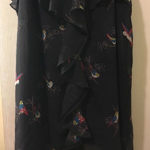 Very simple has little birds and branches on it has a nice rufflle that runs down the center and very fresh top for a hot day.