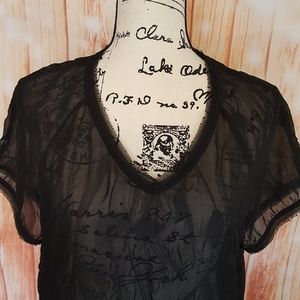 Simply Vera Vera Wang Sheer V Neck Short Sleeve Top Black Size Large Black Crinkle Leaf print.