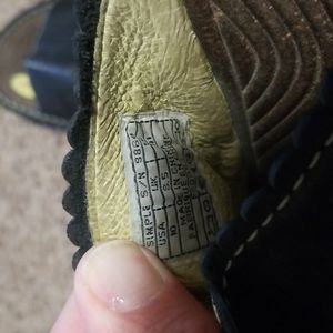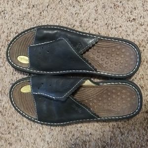 leather uppers. super soft. worn quite a few times still lots of life left. massaging type footbed.