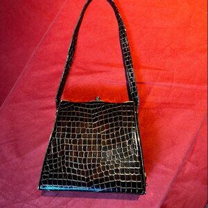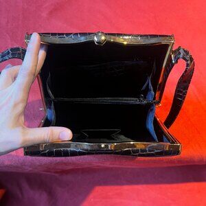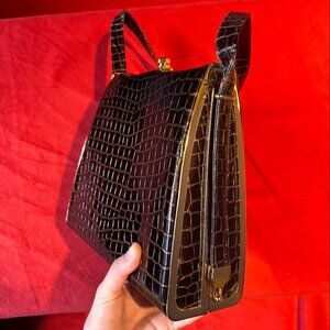 Elevate your collection with this sophisticated vintage handbag featuring very cool croc-embossed patent leather and gleaming gold-tone hardware. The structured silhouette is timeless and versatile, perfect for both formal occasions and chic everyday wear. This bag includes a distinctive metal frame closure for added elegance, a rich brown tone that pairs effortlessly with various ensembles, and an adjustable leather strap for comfortable wear. Its spacious interior makes it functional while remaining a statement accessory. A true classic for the discerning collector.