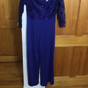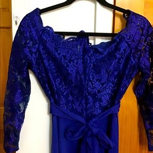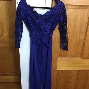 🔴UPDATE🔴. Size is listed as an XL however this runs very small, tag may be wrong. Model is petite, outfit is also long so may work for someone slim and taller than 5’5🔴 Royal blue off shoulder one piece fit with zipper in back. Arm photo illustrates size of arm that can fit in the sleeves. Dies not have belt loops, can be worn with or without it, suggested to tie towards the back. Sheer lace top, no stretch. Only the bottom is stretchy. Runs small. New never worn. Comes from clean smoke free & pet free home.