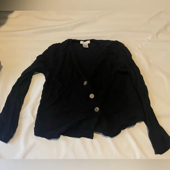Classical black modern blouse, has a nice cut to it with vegan tortoise-shell buttons. Great for casual days or business casual
