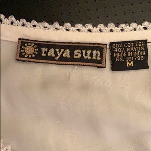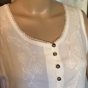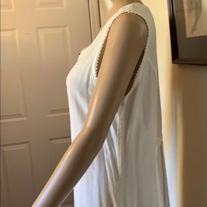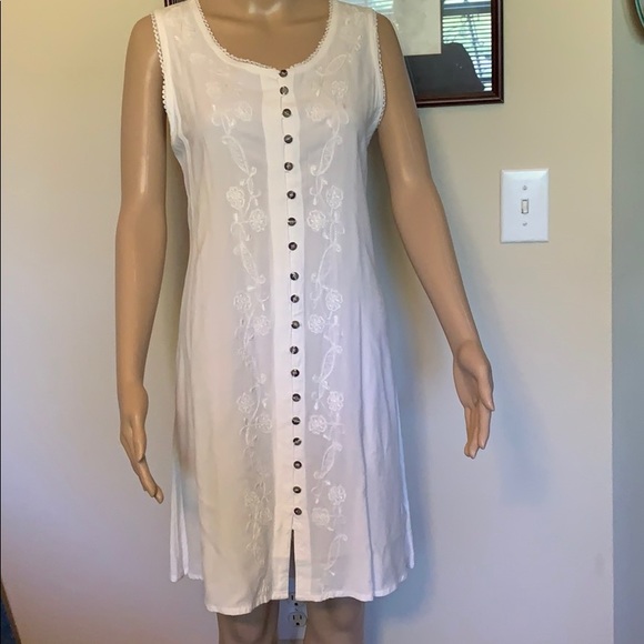 This is a beautiful off-white soft cotton dress. It has a number of buttons down the front which can be unbuttoned top or bottom depending on how sexy you want to look! There is a simple drawstring in the back to fit the waist to yours and a little crochet trimAround the neck line and arm holes. It’s a lovely summer dress that can be accessorized for fancy or simple.