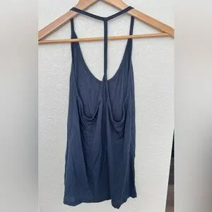 Lightweight navy tank with a racerback strap. Soft, casual fabric. Easy layering piece. Versatile wardrobe staple.
