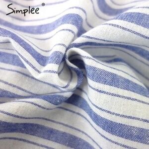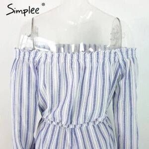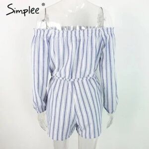 Simplee Apparel Blue And White Pinstripes Off the Shoulder Romper Women L