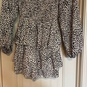 Stylish romper with a black and white pattern. Features long sleeves and a tiered design. Perfect for any occasion.