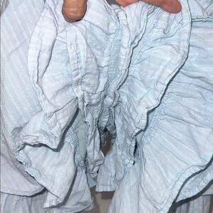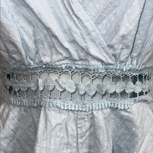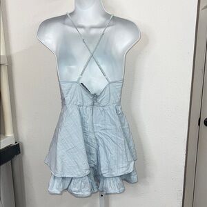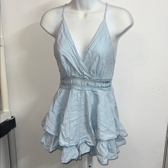 Elegant sky blue romper with ruffle layers. Features a lace waist accent. Ideal for casual wear.