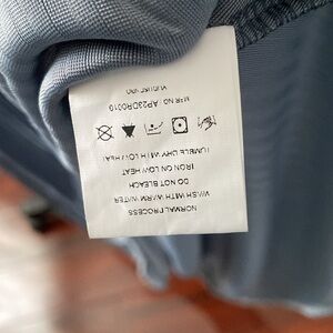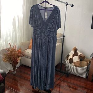 Elegant blue maxi dress. Features pleated design. Short sleeves and V-neckline. Perfect for any occasion.