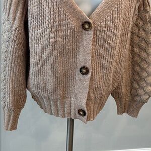 Care / materials tag is cut out. Embrace warmth and style with this tan cardigan from Simplee Apparel, featuring a cozy cable knit design. Its relaxed fit and hip-length cut make it perfect for layering during cooler days.