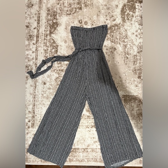 Stylish jumpsuit with stripe pattern. Strapless design with a tie waist belt. Ideal for modern wear.