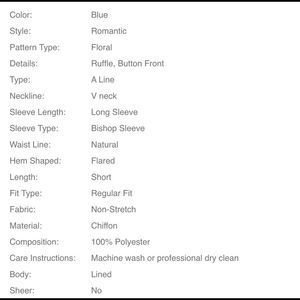 Features sheer long balloon sleeves, v neckline with buttons (can be worn open or closed), sheer back bodice, and fit and flare skirt. Flattering on any body type!