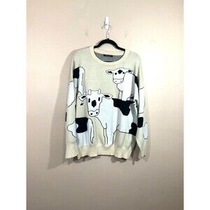 Simplee Womens Cow Print Crew Neck Sweater XL Beige Long Sleeve Soft Farm Animal