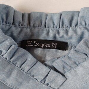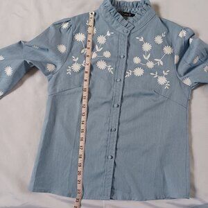 Simplee Womens Top Light Blue Mock Neck Puff Sleeve Folk Blouse Shirt Size XS