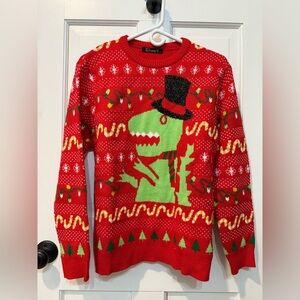 This item is a women's red sweater from the brand Simplee, featuring a festive Christmas theme with a T Rex dinosaur wearing a hat. It is a size small and falls under the pullover style category. Perfect for adding a touch of holiday cheer to your wardrobe, this sweater would be a fun and quirky choice for Christmas gatherings or parties.