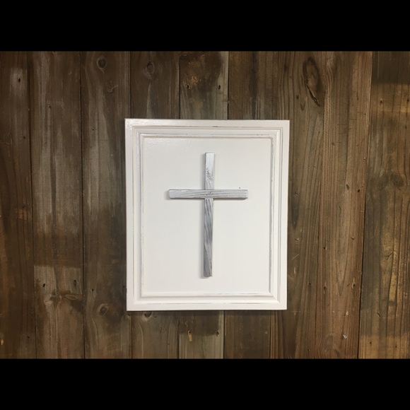 A simple but eloquent silver tone wooden cross accents a stark white reclaimed shaker door wall hanging that is sure to add a touch of charm to any area.