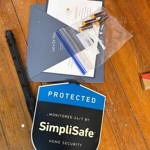 SimpliSafe security system featuring base station, keypad, and sensors. Still in packaging.