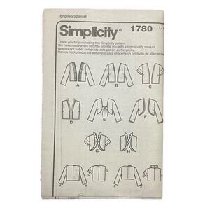 Simplicity 1780 Sewing Pattern for Misses' Bolero Jacket and Vest in sizes 16-24. This pattern is new and uncut, ready for your next sewing project. Create stylish boleros and vests with ease using this fantastic pattern! Perfect for adding a unique touch to your wardrobe.